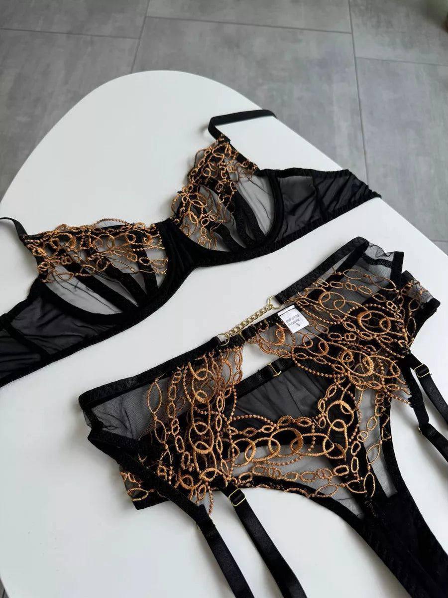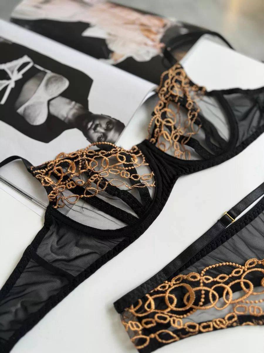 Amber Muse, siyah yarı transparan tülün üzerinde eriyen karamel, bej nakışlarıyla bedenini adeta bir sanat formuna dönüştüren lüks bir tasarım.